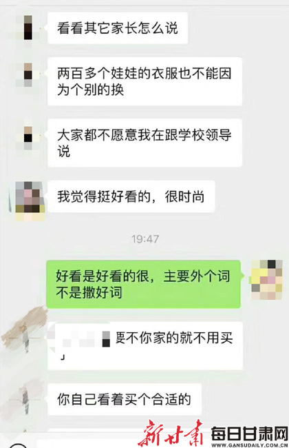 “我就想着要订购二百多套衣服,孩子不懂上面的内容,可是未免不会好奇,这种有侮辱性的文字影响了孩子怎么办。”王先生说,起初还和老师好好地沟通,老师表示王先生可以不订购,但王先生考虑到不只自家孩子会受到影响,据理力争。最后该老师提出让王先生的孩子申请转班,并把王先生踢出了群聊,王先生想不通,明明是好心,怎么却是这种结果,毕竟衣服还没有订购,改换一下应该没问题。“我估计就是老师觉得我多事了,越说态度就越差了。”王先生越想越生气,于是就发了这条朋友圈。