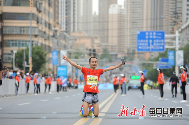 一名参赛选手在冲过半程终点后激动地跪在了终点线上
